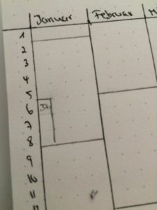 Man startet einfach auf einer neuen Seite und trägt die Termine in der Reihenfolge ein, in der sie auftauchen. Das Log ist also nicht chronologisch sortiert. Rechts schreibt man Datum und Termin ein und links macht man einfach einen Punkt in die entsprechende Spalte des Monats.